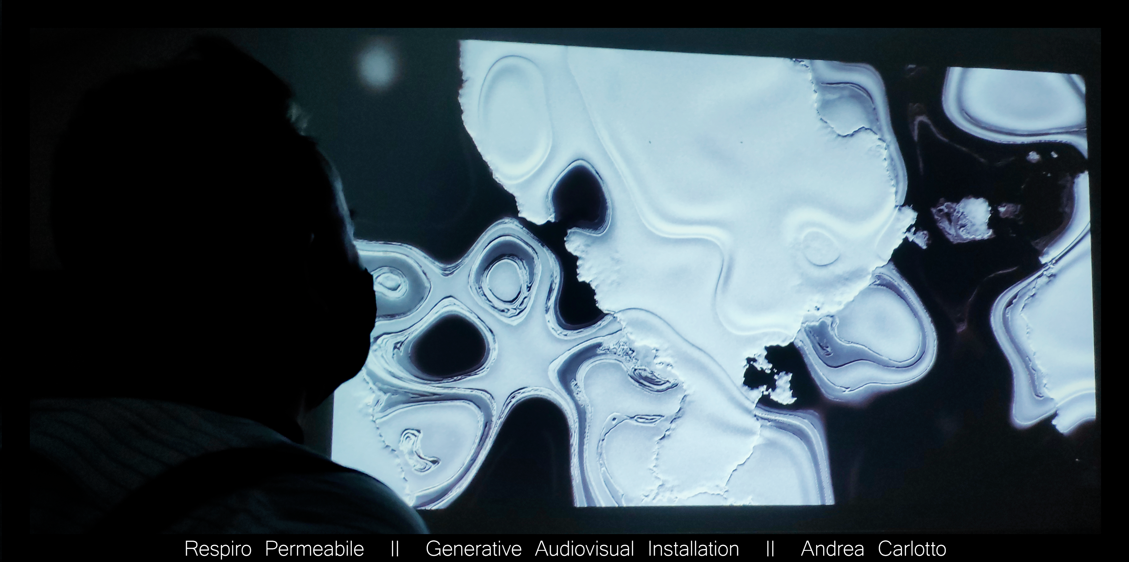Nata durante il periodo di lockdown dei primi mesi del 2020, Respiro Permeabile è un’installazione audiovisiva generativa dedicata alla complessità, alla permeabilità ed interdipendenza dei livelli e dei registri dello stare al mondo dell’essere umano. La riflessione sulla situazione contingente di confinamento sociale è stato l’innesco per la genesi del lavoro, un lavoro rivolto essenzialmente alla costruzione di un ecosistema audiovisivo riverberante ed interdipendente realizzato tramite due algoritmi generativi di natura randomica (generatori di rumore, generatori di eventi casuali) che creano suono ed immagine in tempo reale ed in costante ed inesorabile mutamento. Il pubblico che accederà all’installazione non potrà mai vedere la stessa immagine o ascoltare la stessa sequenza di suono, di musica. Per sua natura Respiro Permeabile è in continuo , inesorabile mutamento, e mai assomiglierà al suo stato immediatamente precedente, ma preso nel suo insieme, nel suo continuo divenire, manifesta una coerenza estetica ed “esistenziale” propria e “personale”. Le due dimensioni – il registro sonoro ed il registro visivo – si informano e si modificano a vicenda in maniera complessa, interdipendente e precisa, e nel loro continuo dialogo sinestesico sollecitano le coscienze (e le incoscienze) dei partecipanti all’esperienza ad una ricerca di equilibri possibili, ad una attività, anch’essa inesorabile e mai uguale a sé stessa di costruzione di senso, di adattamento, costantemente immersi in un contesto ipnotico di fascinazione al cospetto della complessità. Respiro Permeabile è una meccanica audiovisiva immersiva, in azione per ispirarci a percepire la natura duale (affascinante nella sua straripante energia creativa e terrificante nella sua ineffabile vaghezza) della nostra istintiva e costante pulsione di ricerca di un senso, di un ordine possibile, di un orientamento, di una direzione, immersi come siamo nella complessità che ci circonda e ci costituisce, ci definisce, ci attraversa, e che governa ogni dimensione della nostra esistenza.